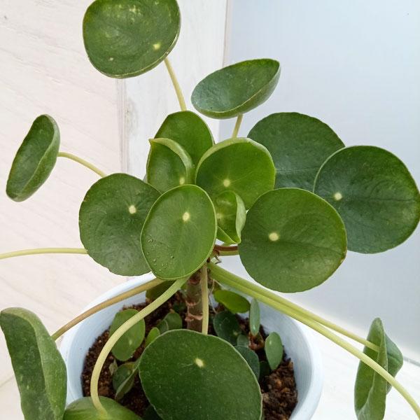 我が家のピレア・ペペロミオイデスは幹上がりと呼ばれているタイプで、通常は根本からわさわさと葉っぱが生えているのですが、幹の上から生えています。